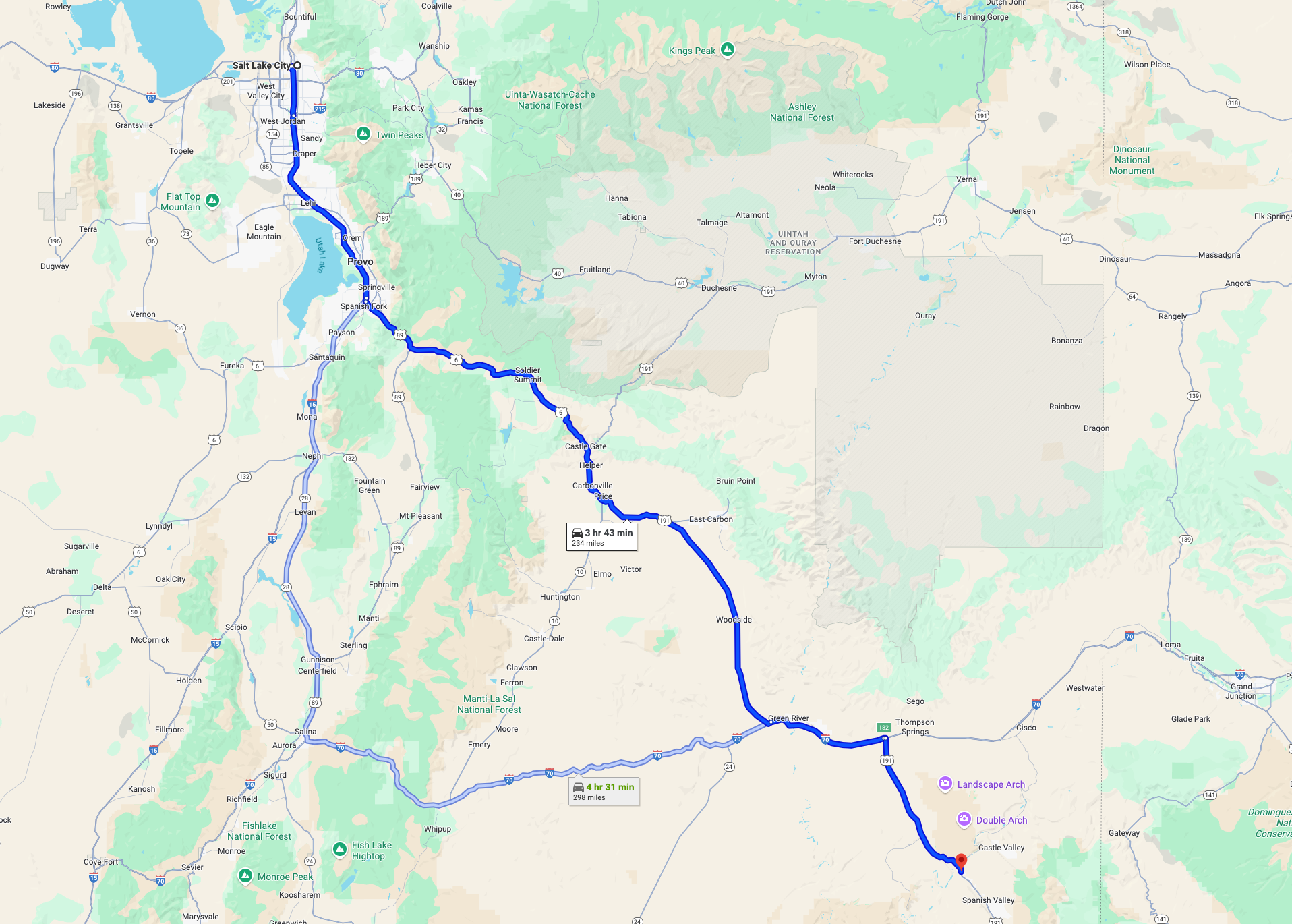 Recommended Route: I-15 South to US-6 East to I-70 East, then take US-191 South to Moab